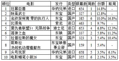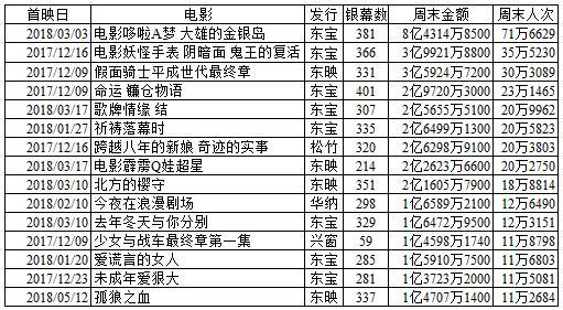 上周末5月19日至20日,日本电影市场观影人次前十位的影片,及各自票房收入状况一览: