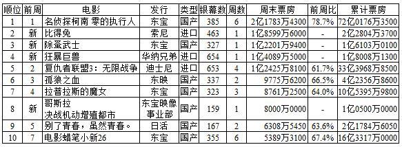 东映发行的《孤狼之血》上映第2周6位,上映以来9日间累计票房收入4亿2356万8600日元,最终票房收入预期值维持8亿日元。东宝发行的《拉普拉斯的魔女》上映第3周7位,顺利突破10亿日元。上映以来17日间累计观客数81万0039人次,累计票房收入10亿5395万9800日元,最终票房收入预期值维持15亿日元。