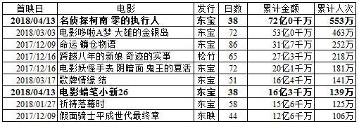 东宝发行的《名侦探柯南 零的执行人》连续6周首位,上周有件事还忘记说了,系列电影过去连续首位最长纪录是《名侦探柯南 远海的侦探》连续4周首位。周末2日间观客数约16万1千人次、对前周比80.9%,票房收入2亿1783万4300日元、对前周比78.7%。上映以来38日间累计观客数552万6858人次,累计票房收入72亿0176万3500日元,是系列电影史上初突破550人次、70亿日元。除去首映日效果目前对前作比111.4%,最终票房收入预期值维持80亿日元以上,最终观客数预期值维持600万人次以上,可以挑战620万人次。