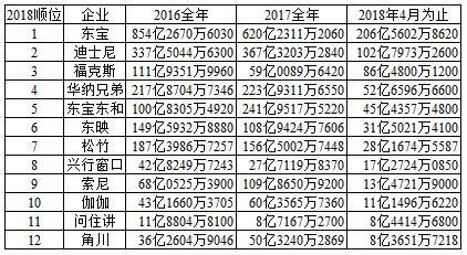 日本主要12大电影发行商所发行作品最近三年间票房收入: