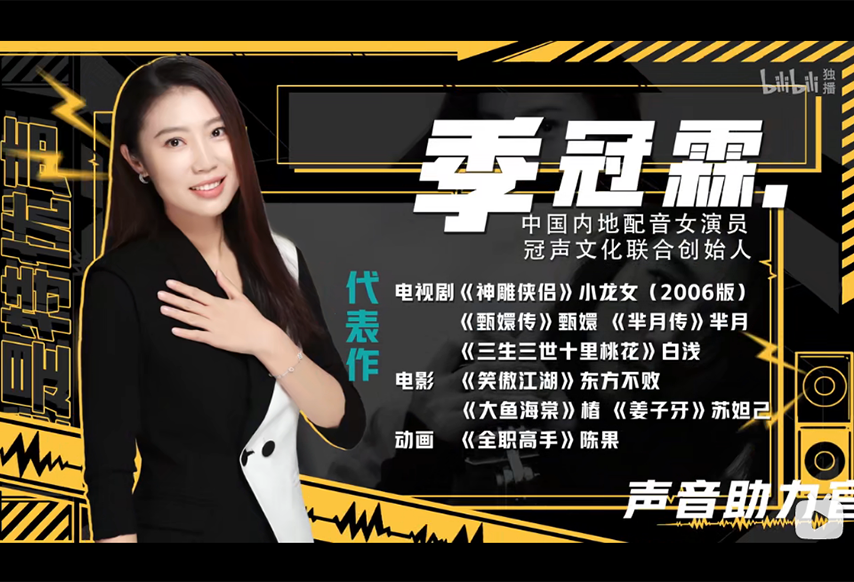 节目组请来的声音助力官季冠霖,就是冠声学院创始人之一,大家也应该非常熟悉了,她配过非常多的偶像剧女主,说是“流水的偶像剧女主,铁打的配音女主”也不为过,代表作品有电视剧《倾世皇妃》马馥雅、《甄嬛传》甄嬛、《爱情悠悠药草香》黄采薇、《锦绣未央》李未央、《孤芳不自赏》白娉婷、《醉玲珑》凤卿尘、《三生三世十里桃花》白浅、《谈判官》童薇、《宸汐缘》灵汐等。