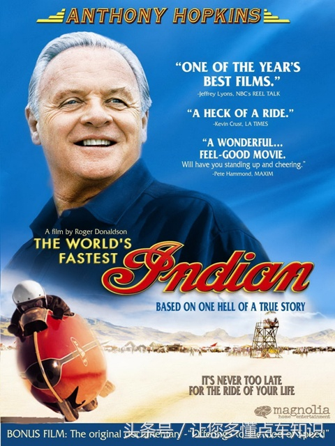 9.《世上最快的印地安摩托》(world's fastest indian)是根据伯特·孟若(burt munro)的真实故事拍摄。该片由罗杰·唐纳森导演。本片讲述新西兰赛车传奇人物伯特·孟若,在20世纪60年代开始骑着摩托车屡破世界纪录。霍普金斯饰演这个传奇的摩托车手,这位新西兰人在修理和改装了他的1920年印第安牌侦察摩托之后,冒险来到美国犹他州以完成他毕生的愿望:在巴纳维亚盐带平地上驾车狂奔。他最终创造了陆地速度的世界纪录。