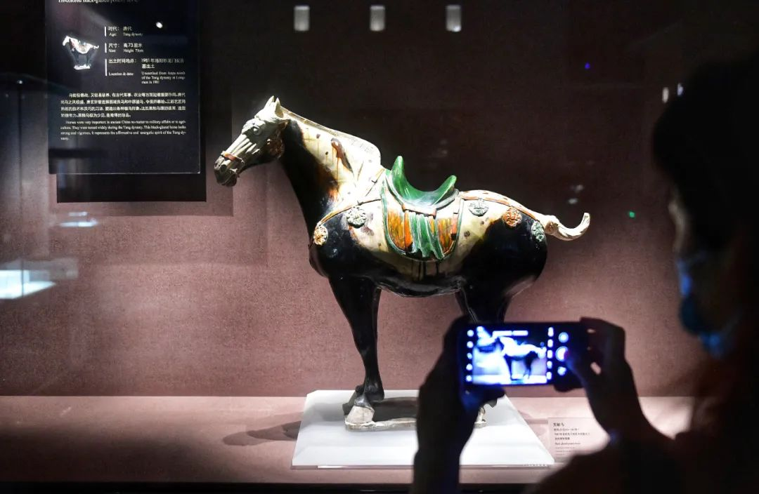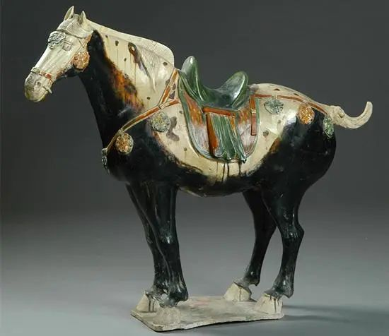 这尊唐三彩黑釉马全身黑色,唯马面、鬃尾和四蹄为白色,鞍鞯为绿、黄、白三色相间,在唐三彩中实属罕见,是文献中“龙种神驹,四蹄踏雪”的艺术再现。