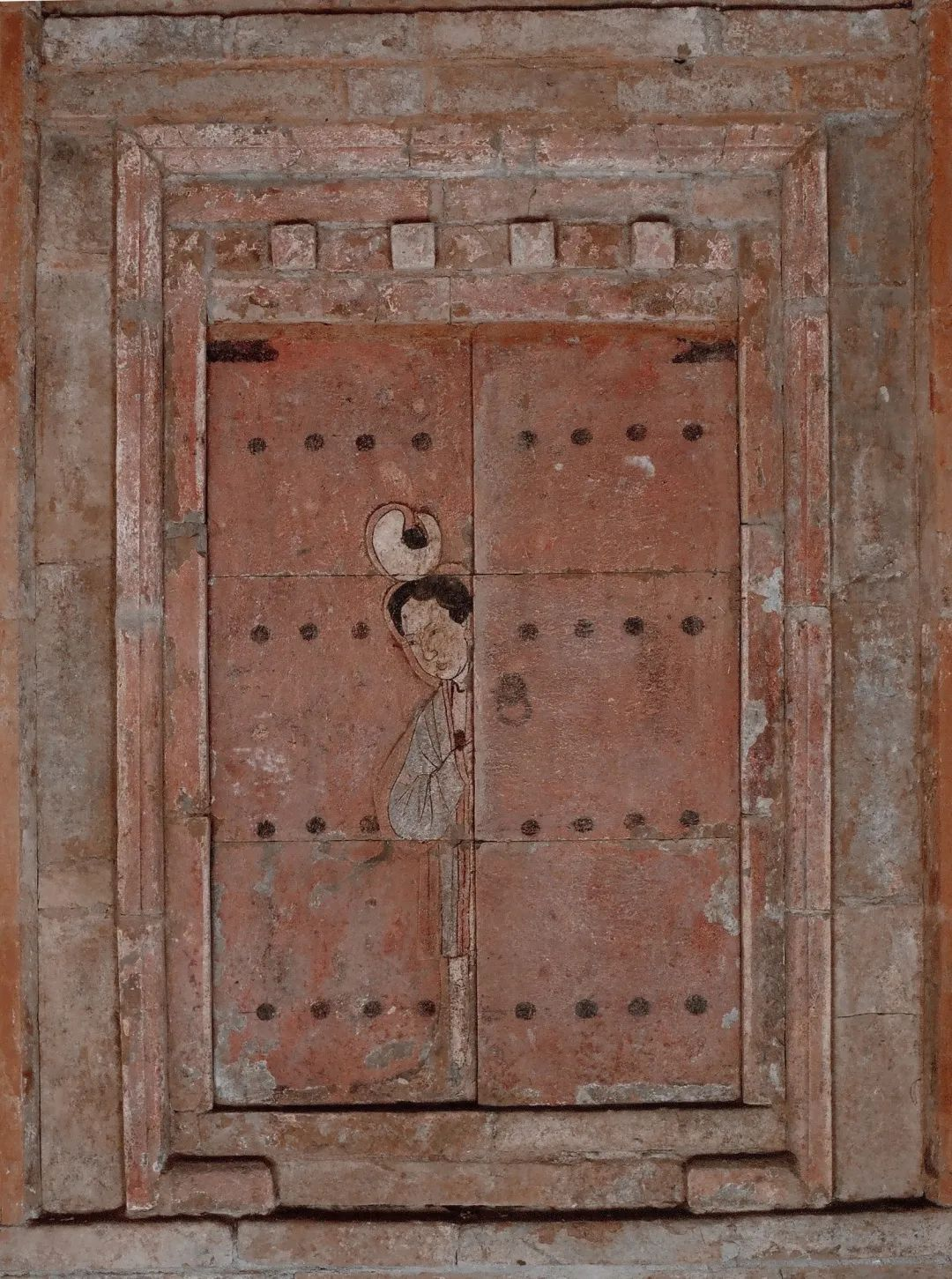 门扉半掩中一个头戴白色团冠,身着淡青色上衣、白色裙子的貌美女子从两扇门中露出半个身子,神态娇羞,似在观望,又好像在发呆,让人对她身后的世界也充满遐想,将狭小的墓室空间在思绪中扩大。