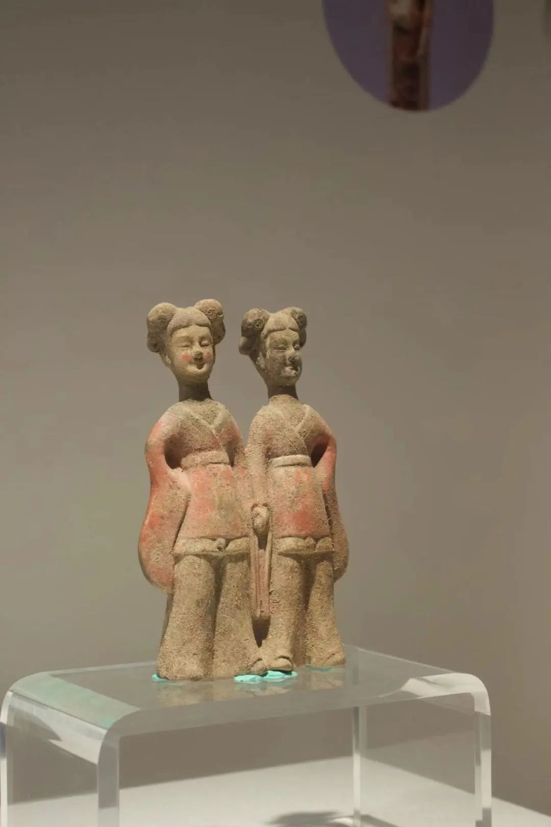 这是一件北魏彩绘双髻牵手女俑,出土于北魏重臣杨机的墓葬中,是很少见的少女牵手的形象。她们的发型是典型的未嫁少女的双挂髻,而穿着打扮则是典型的南北朝风格,上衣和下裳分开。上衣是交领广袖窄衣,一般里面还会有一件圆领的中衣作为内衬,下裳通常是百褶裙,外面还会有一件短一点儿的围裳。