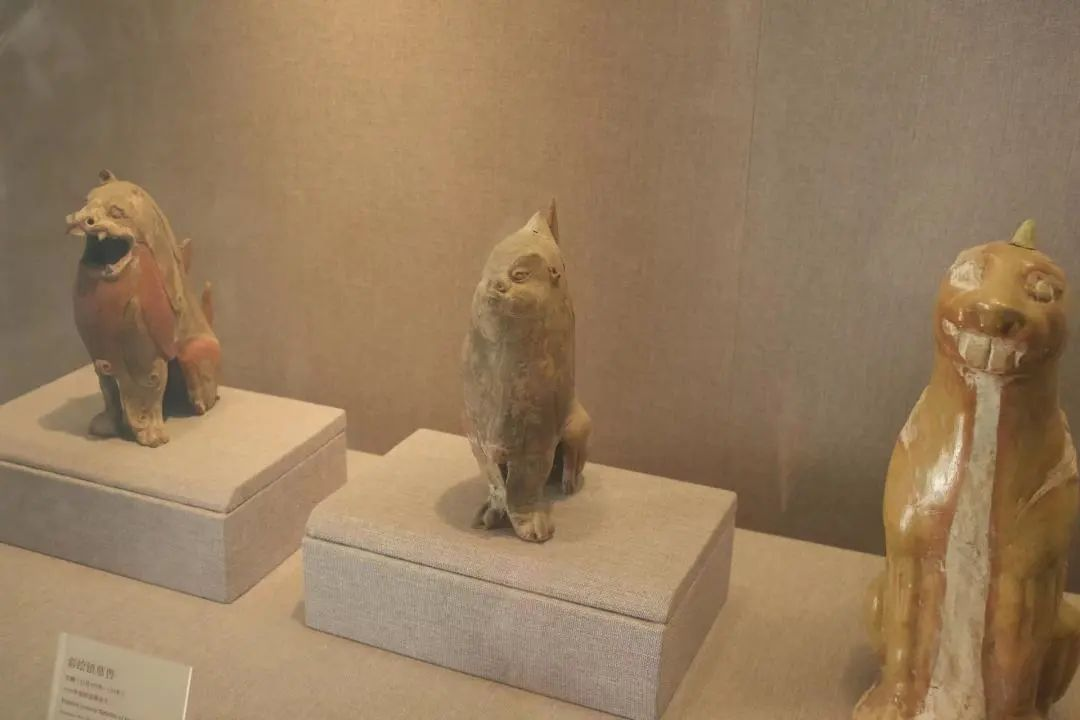 这组北魏时期的彩绘镇墓兽共有三只,这三只镇墓兽却挺可爱,一只龇着大牙,一只嘟着小嘴,还有一只长着朝天鼻,张着大嘴。