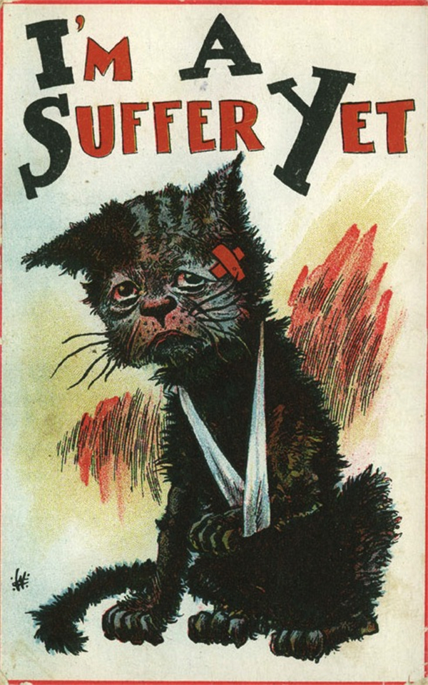 显然,当时的男人似乎有意将猫女性化,那女人们会怎么想?英国女作家多萝西·贝维尔·尚皮永(dorothy bevill champion)也觉得自己和猫很像。她在1909年出版的著作《每个人的猫书》中指出,女人和猫有很多相似之处,比如她们都很敏感,害怕刺耳的声音或大声的说话声,以及经常被误认为愚蠢。尚皮永在书中写道:“我见过很多和猫的智力相关的案例,我只能说,如果一只猫很蠢笨,那是因为这只猫缺乏教育。”这句话可是话中有话,因为当时女性运动的一个核心争论点就是女性是否和男性一样聪明。女性同胞们不卑不亢地指出:女性看起来不够聪明,主要原因是接受的教育太少,所以,女性要争取和男性同等的受教育权。看来,尚皮永既是在为猫辩护,也是在为女性辩护。她表面上评价猫,实际上在助女性运动一臂之力。