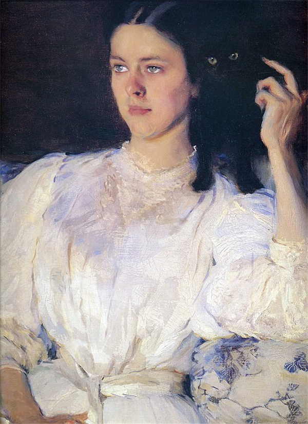 如果说男艺术家画的女人和猫时而含有性暗示的话,那么,女艺术家对女人和猫同框的理解似乎大相径庭。上个世纪20年代,美国肖像画家塞西莉亚·博克斯(cecilia beaux)创作的一幅女人和猫的作品《西塔和萨里塔》(图19),庄严肃穆。这幅画流露的是谨慎和保守,以及女性对情感的控制。身着白衣的西塔笔直地坐着,她的目光僵硬,而好奇的黑色萨里塔趴在女主人的肩膀上,小心翼翼地观察着这个世界。
