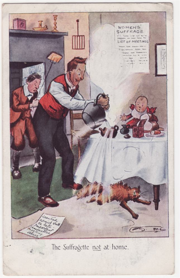 19世纪中、20世纪初,英、美等国的民众以温和方式争取女性的选举权。然而,也有人对此表示反对,他们的理由是:女性参与政治会削弱她们在家庭中的角色。当时,女性通常主管家务,而男性被鼓励参与公共事务。美国的反女性选举权组织创作了很多以猫为主角的漫画,将参选的女权运动者描绘成愚蠢、幼稚、不适合参政的形象(图6、7),暗示女性的选举权和猫的选举权一样荒谬,因为女性和猫都没有能力投票。美国的一些反女性选举权广告也象征性地使用了猫。一些人认为,如果女人放弃家庭投身政治,男人就不得不抚养孩子、做家务。这类漫画大都呈现投身家庭的男人笨手笨脚、懦弱无能的样子。此时,受到惊吓的猫咪成为传统家庭受到威胁、呼唤女性回归家庭的象征(图8)。