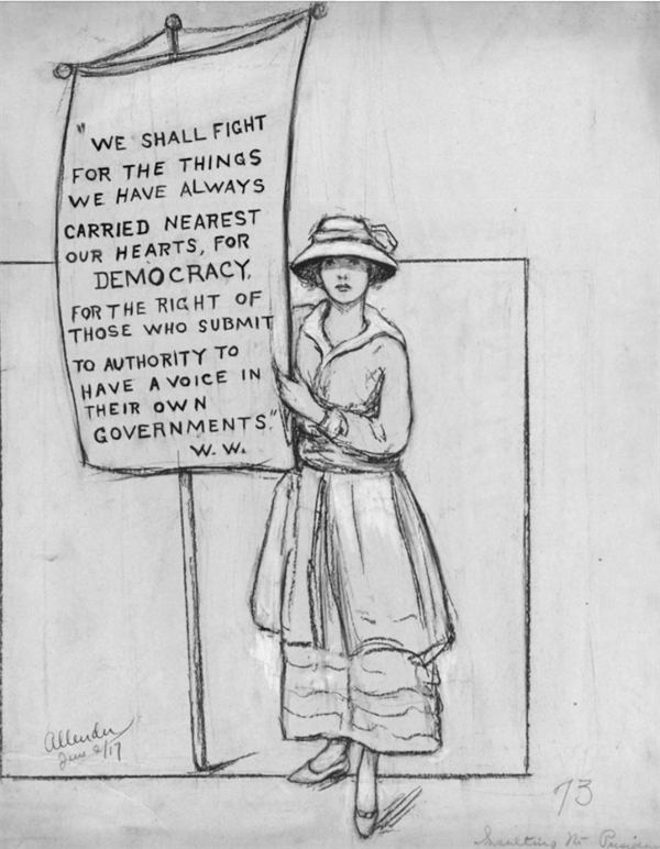 同一时期,美国女艺术家妮娜·埃文斯·阿伦德(nina evans allender)经常创作一些关于女权运动的漫画,呈现坚强独立的女性形象。从1914年到1927,妮娜为选举权运动画了150多幅漫画,逐渐改变了主流社会对女权运动者自私、简单、软弱的印象。妮娜创作的一组名为“阿伦德女孩”(allender girl)的漫画深入人心。“阿伦德女孩”描绘的是20世纪的“新女性”(图10),她们年轻、精力充沛、能干,她们对事业有着强烈的热情。只不过,这些漫画中没有猫。