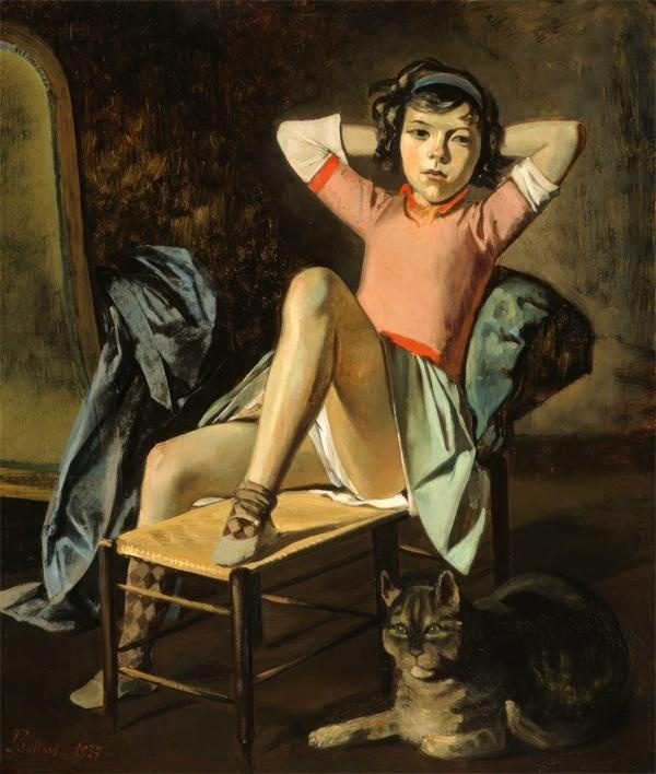 法国画家巴尔蒂斯(原名balthasar klossowski)也喜欢画女人和猫,并且,他对猫和刚迈入青春期的女孩有一种特殊的迷恋,他晚年曾表示:“小女孩是唯一可以成为小猫的东西。”1920年,十二三岁的巴尔蒂斯就画了40多幅素描作品,讲述了一只名叫mitsou的猫的故事。1935年,巴尔蒂斯又创作了题为《猫王陛下》的自画像,更直接地表达了自己对猫的喜爱。上世纪30-50年代,巴尔蒂斯以青春期的女孩和猫为主题,创作了“猫与女孩”系列画作。在这些作品中,猫和青春期少女象征着青春和巨大的能量。画中的女孩大都是巴尔蒂斯的邻家女孩特蕾莎,巴尔蒂斯对这个女孩着迷,为她画了十多幅画(图15、16)。这些作品生动地呈现了青春期少女的情绪,被认为是巴尔蒂斯最好的作品。