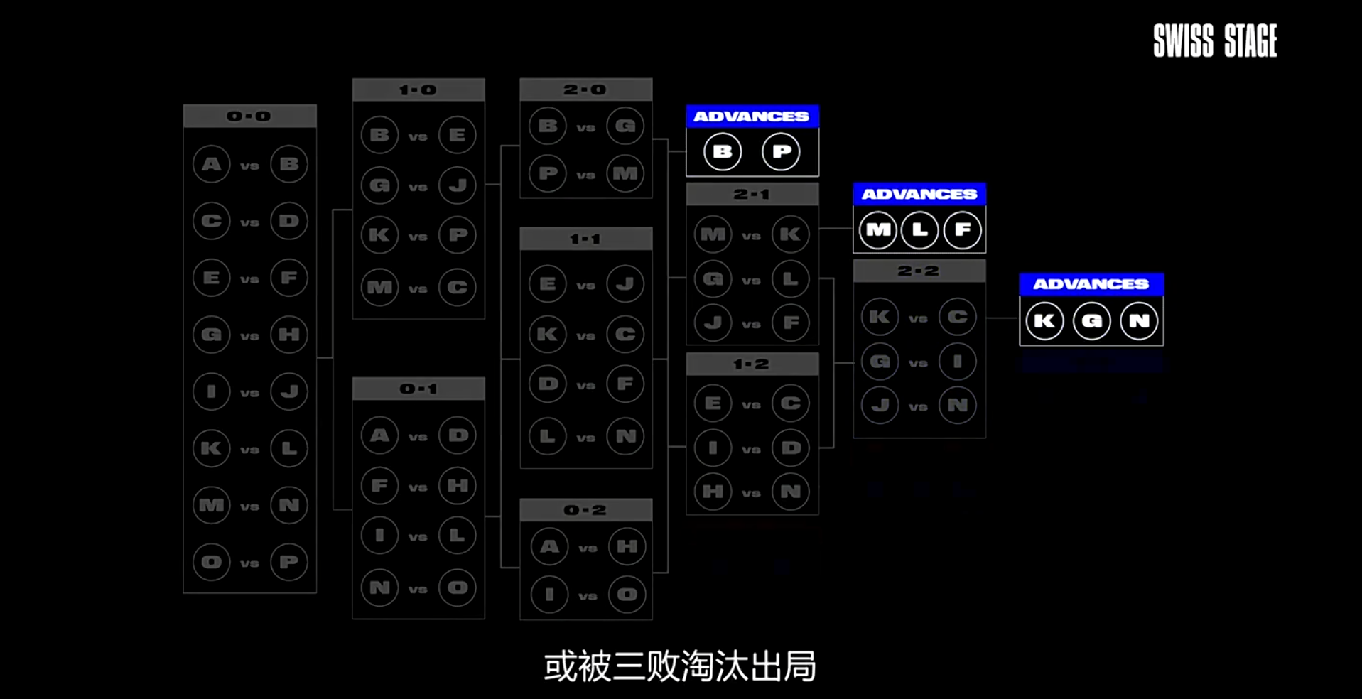 16支队伍首先将根据种子排序抽签分为八个bo1对阵,第一轮同赛区队伍不会相遇。第一轮比赛后,将再次进行第二轮抽签,在战绩相同的队伍之间进行比赛,没有附加抽签限制。