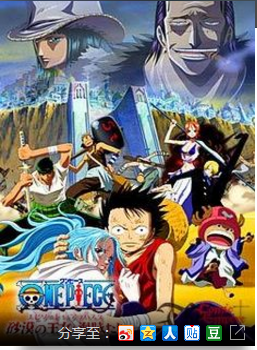 请点击此处输入图片描述请点击此处输入图片描述简介:沙漠之国阿拉巴斯坦,虽然当地气候恶劣,但是国王寇布拉爱民如子,为了将国家建设成美丽的绿洲始终和百姓不懈努力。然而就在两年前,奇怪的现象离间了国王和百姓的关系。因为容易引起纷争,世界各国已严禁使用名为dance powder的降雨粉。但是阿拉巴斯坦曾大量购入dance power,在此之后,除国王所居住的阿鲁巴纳降雨正常外,该国其他区域全部为干旱所统治。一些民众认为寇布拉为己牟利,在克罗克塔尔的煽动下,反叛军揭竿而起,国家危在旦夕。寇布拉的女儿微微公主逃离国家,与路飞等人结伴而行。他们偶然遇见了会变换各种容貌的孟德勒,从而得知克罗克塔尔的阴谋。海盗团扬帆起航,向阿拉巴斯坦进军,一场沙漠大冒险就此展开