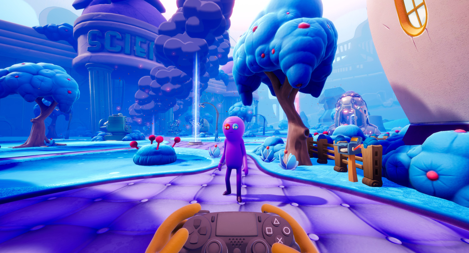 《trover saves the universe》的主人公的狗狗不幸被疯子格罗孔绑架。为了解救狗狗和宇宙,玩家必须与紫色小怪兽特罗弗合作。