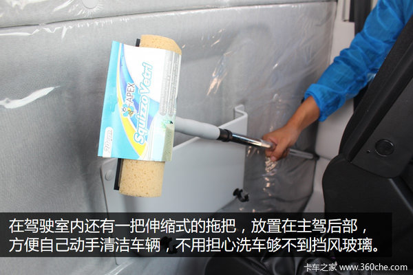 为了方便清洁车辆,在驾驶室内(主驾后面)还“藏”了一把伸缩式的拖把,当要使用的时候可以快速的把拖把组装起来,随时随地都可以打扫车子。由于车辆比较高,如果没有一把拖把的话可能清洁起来会非常费力。