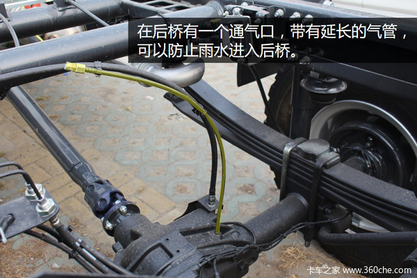 在后桥中间还有一个通气孔,方便后桥车桥内部的空气拍出来,考虑到车辆涉水问题,在后桥的通气孔上加装了一根气管,气管的高度和车架高度相当。并且在气管的末端加装了单向阀,防止外界的水分进入车桥内部。