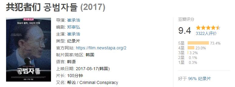 《共犯者们》在豆瓣的评分相当高,有3322人进行评价,评分为9.4分,浩宇96%的纪录片。