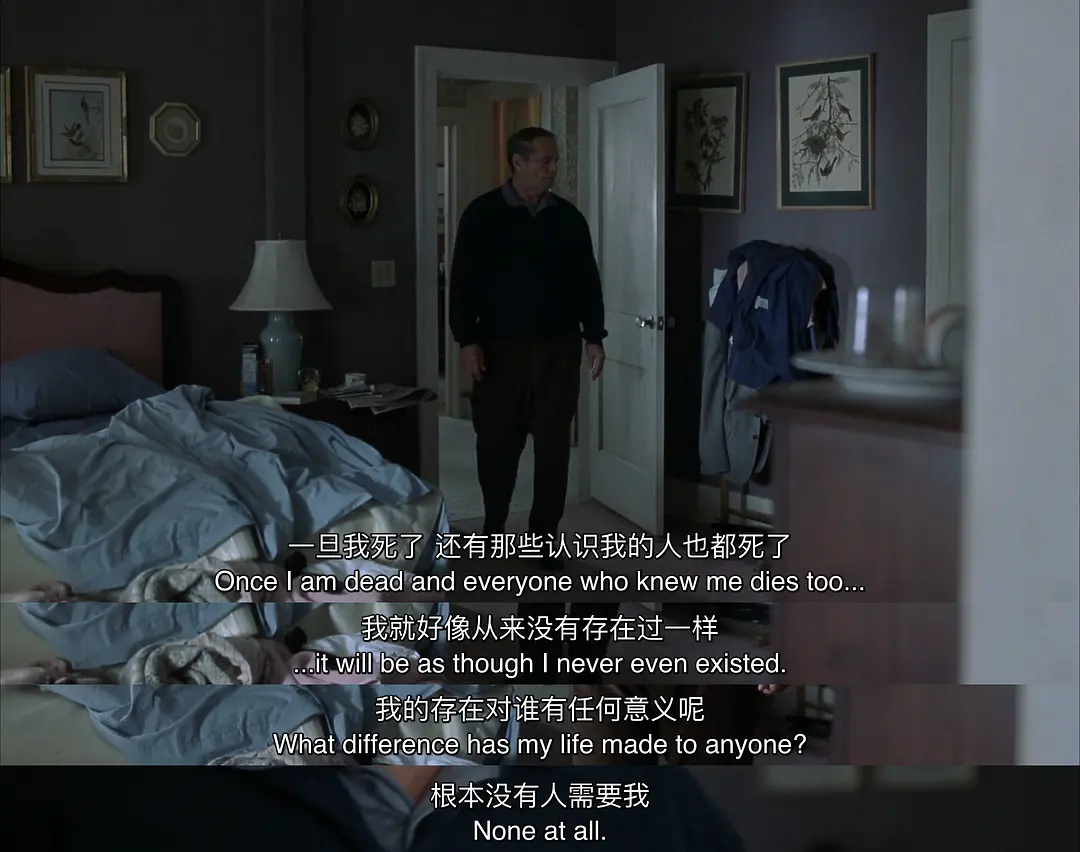 " 《关于施密特》这部电影之所以伟大,就是它揭开了一个普遍命题,描述了一个人类社会中大多数人需要面对的困境,即人们都需要面对容颜的苍老、体力的衰退、权力的流失、丧偶的悲痛。这些都是风烛残年的苍凉。一个人不管曾经多么伟大、惊天动地或者平凡和卑微,谁都逃不过这些晚景。每个人的晚景具体或许都是不一样的,但其基调却大致如此。忽略掉中间,人们来到这个世界的方式与状态与他(她)们离开的时候都是差不多的。人的孤独与渺小的程度会在人生的初年和暮年里被放大,人的真诚与善良也会在初年和暮年里流露和展现得更多,这里面的隐秘和挣扎的种种实在是代表了更本真的人。