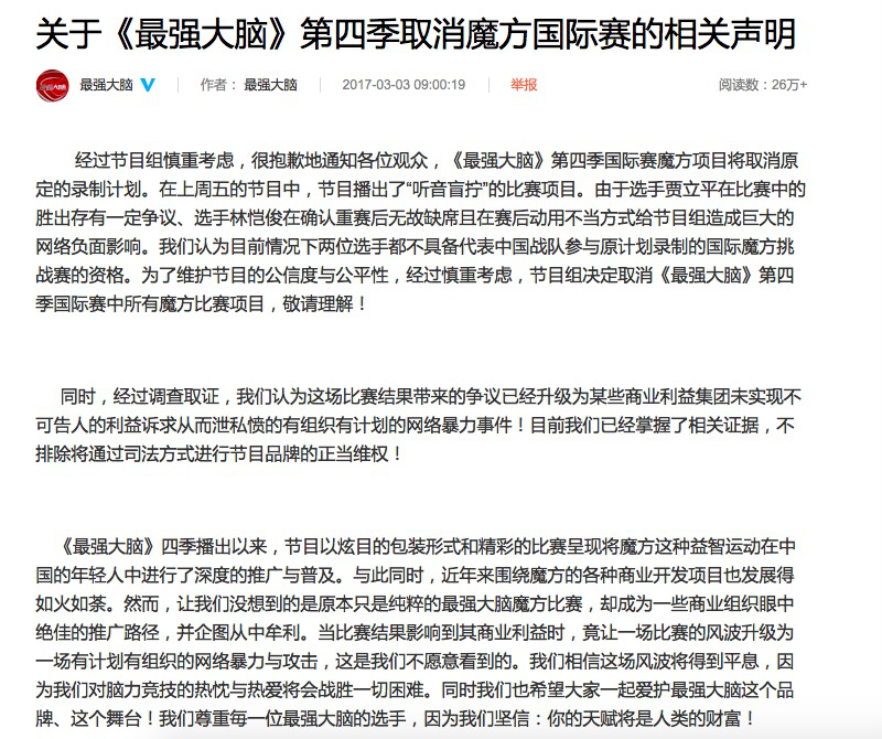 短短几天时间,一个持续四年口碑极高的节目受到开播以来最严重的质疑、公信力几乎降到低谷。而在今天,节目组也发表了声明,要取消所有的魔方比赛!
