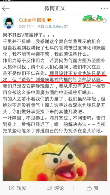 退赛后的事情就顺理成章了,原本血气方刚的林恺俊等人隐忍不发,直到节目播出后才写出一篇精心雕琢的长文,随后魔方圈人士频频出来站队打脸节目组,带头人在贴吧号召几十万魔友有组织地传播对节目进行攻击,不明真相的吃瓜群众暴起怒黑节目带来一波又一波热度,几天的炒作让林恺俊瞬间得到十万多粉丝,魔方吧重新火热,魔方也卖得热火朝天,这波事件策划严谨逼真环环相扣,让人不得不服!