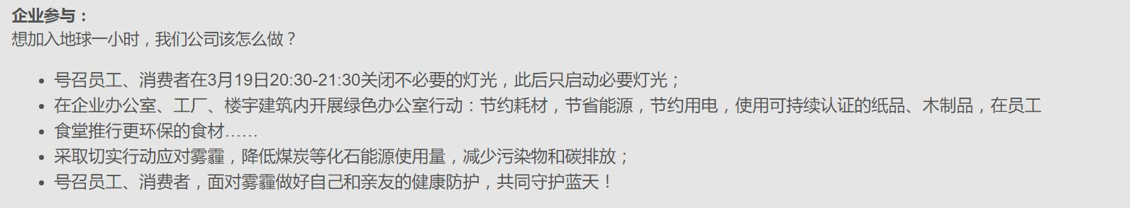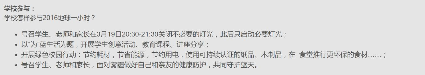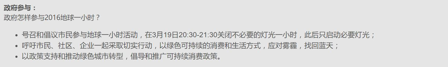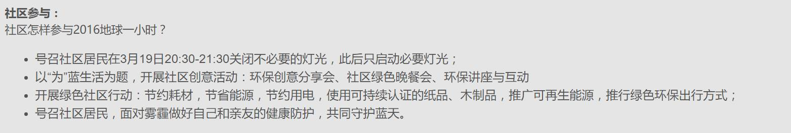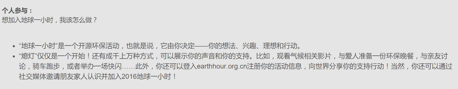 2016“地球一小时”的主题是“气候、人类、社会”。在中国,继2014和2015年的地球一小时持续关注我国最紧迫、最受关注的环境议题——雾霾,发出“蓝天自造”和“能见蔚蓝”的主题后,今年中国地球一小时继续从公众盼望的蓝天入手,号召公众从衣食住行乐做起,在日常生活中践行可持续的生活和消费方式,鼓励每一位个人面对气候变化施行自己的解决方案,通过每个人小小的改变,让雾霾不再,蓝天重现。