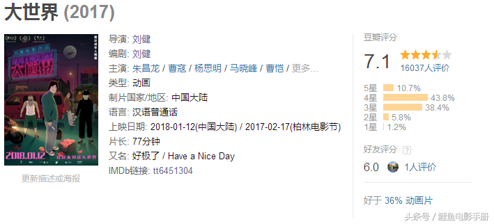 鲤鱼看得动画片不多,在今敏和宫崎骏中选边的话,我会选今敏。我个人更喜欢动画人物取代演员,其余表现手法题材和普通电影区别不大的动画片。这部导演刘健的创作初衷应该也是如此。
