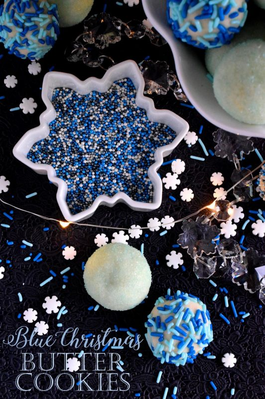 " 说到蓝色,看看这些蓝色的圣诞黄油饼干!同样,它们也没有蓝色,但像大多数圣诞饼干一样,洒点总是让饼干看起来更有节日气氛的好办法。约翰买了4包威尔顿的蓝色糖果屑,我知道这很适合做奶油饼干。