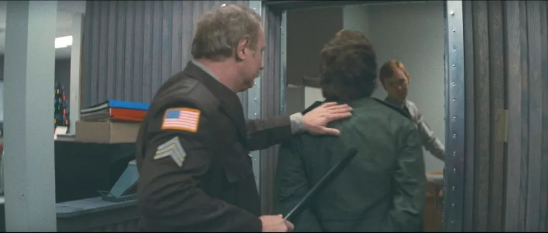 在老警员亚瑟·高尔特带着两名警察试图给兰博刮胡子时,兰博挣脱了三人的控制,用拳头杀出一条血路,抢回了自己的刀并逃到警察局外面。
