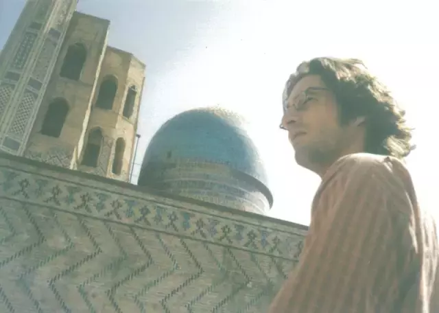 每天站在流沙掩埋的阿弗拉西阿卜遗址山上,遥望远处地平线,贝贝哈嫩清真寺绿松石的穹顶闪烁光芒,撒马尔罕金色的大城就在眼前。贝贝哈嫩,帖木尔汗(1370-1405年在位)的宠妃,胡人版的杨贵妃,中亚版的泰姬·玛哈尔;是她令不可一世的帖木尔汗忘却沙场,沉浸在她潋滟的秋波里。西方作家都喜欢指出贝贝哈嫩来自中国,她出生于中国境内,确切说来自西域的察哈台汗国。贝贝是阿拉伯语的“女子”,哈嫩是乌兹比克语的“妻子” (源自“可敦”,突厥语王后),原来贝贝哈嫩的真实名字已经失落在岁月尘埃间。1399年帖木尔汗修建起的贝贝哈嫩清真寺,与西班牙的阿尔罕布拉宫,印度的泰姬陵,喀什噶尔的香妃墓齐名。如果说泰姬陵最夺人眼球的是白色大理石在水中的倒影,那么贝贝哈嫩清真寺,就是以青金石、天河石、绿松石的瓷釉马赛克穹顶醉倒仰慕者。据说修建时,帖木尔汗带回了来自伊斯法罕的建筑师,大马士革的烧砖人,设拉子的瓷釉匠,德里的木雕工。花剌子模构想的宇宙层次,在135英尺高的贝贝哈嫩海蓝色穹顶得以实现。