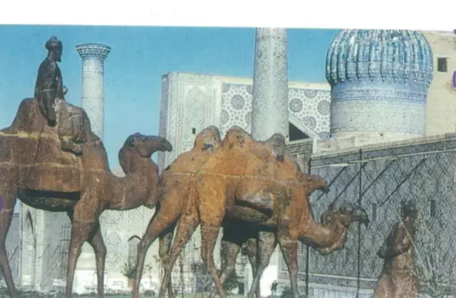 今日撒马尔罕城的象征:贝贝哈嫩清真寺旁的丝路驼队群雕