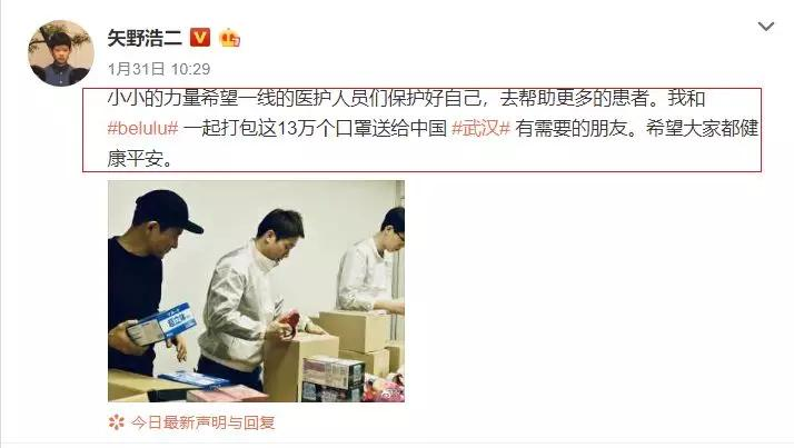 在湖南卫视的《天天向上》特别节目《天天云时间》节目里,许久不见的矢野浩二出镜,他说在知道武汉情况后,立马联系了在日本的朋友,筹集13万只口罩送往武汉,希望能帮助到医护人员。