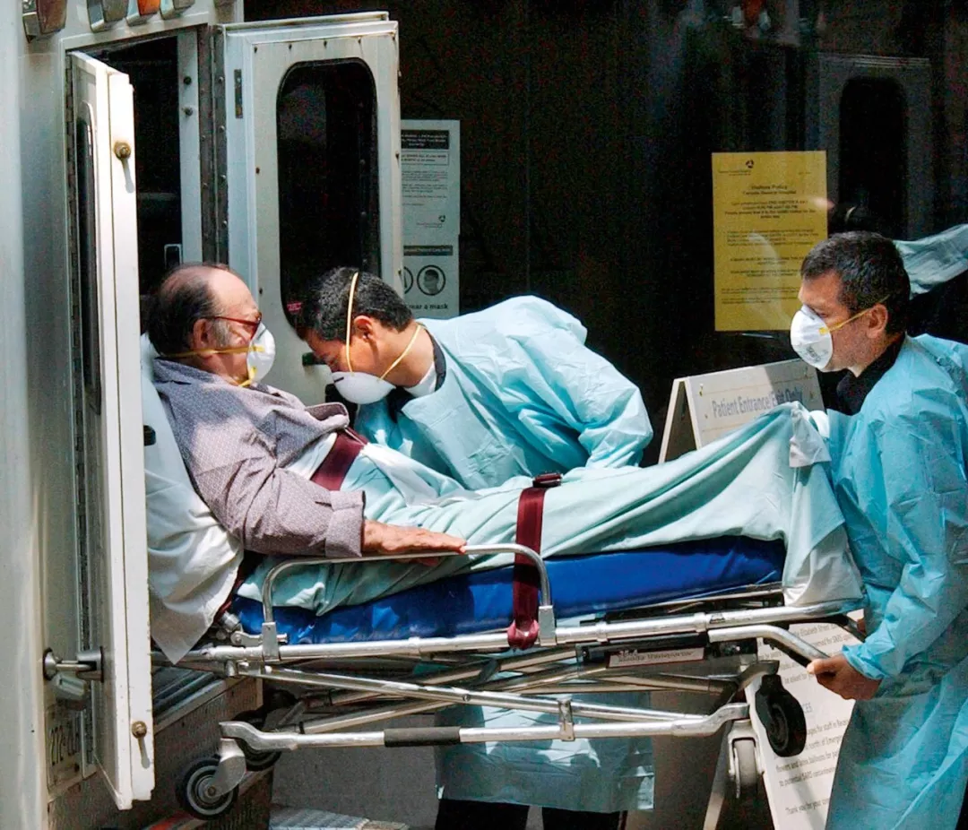 2003年6月11日,加拿大多伦多综合医院,两名穿着sars防护服的医护人员从救护车上抬下一名病人