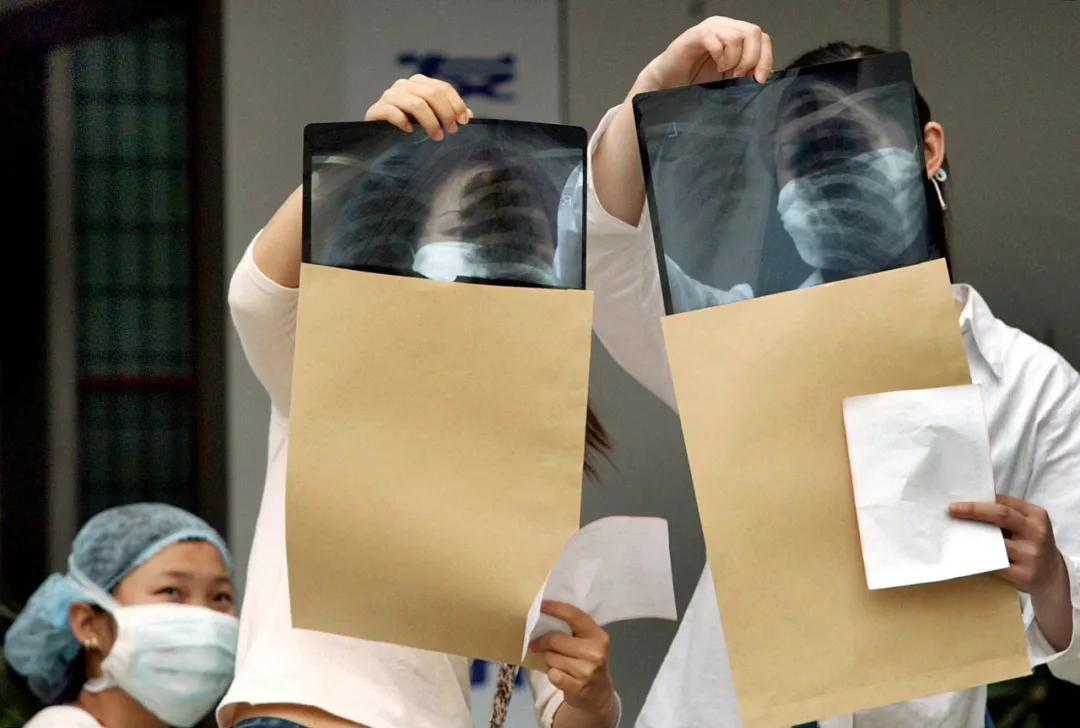 2003年5月14日,在杭州市中医院发热门诊就医的两位感冒患者正急迫地察看自己的x光片中有无肺部感染的迹象