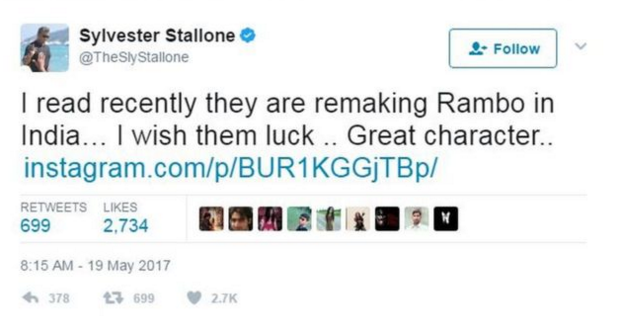 最近,史泰龙也第一次在社交媒体上对这次翻拍做出了回应,他表示,兰博是一个经典的角色,希望他们不要把人物形象破坏掉。随后,史泰龙又对tiger shroff发信息,祝他好运。