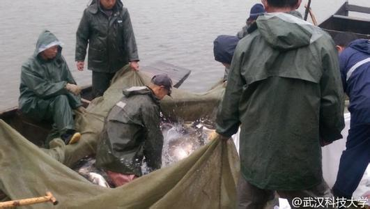 武汉科技大学后勤集团在黄家湖校区沁湖开展大型捕鱼活动,共捕两万余斤鱼,鱼分别送往各个食堂,免费发放给学生吃。