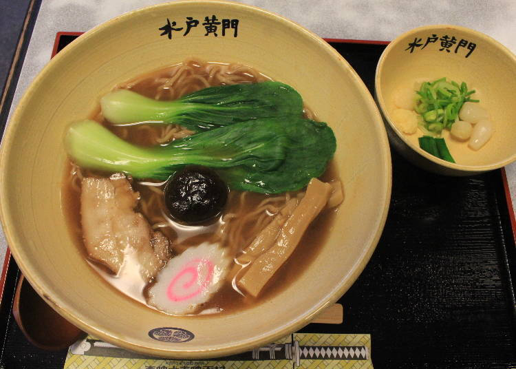 推荐独创的美食是「喜乐」的「水户藩拉面」(800日元)。因「水户黄门」而让大家熟悉「水戸光圀」所吃过的日本最初的拉面,「水户藩拉面」则是将其食谱与当时的文献忠实地重现的拉面。「水户藩拉面」的特色是在面里揉入莲藕粉,以及添加「五辛」(韭菜、薤、葱、蒜头、姜)的辛香料。