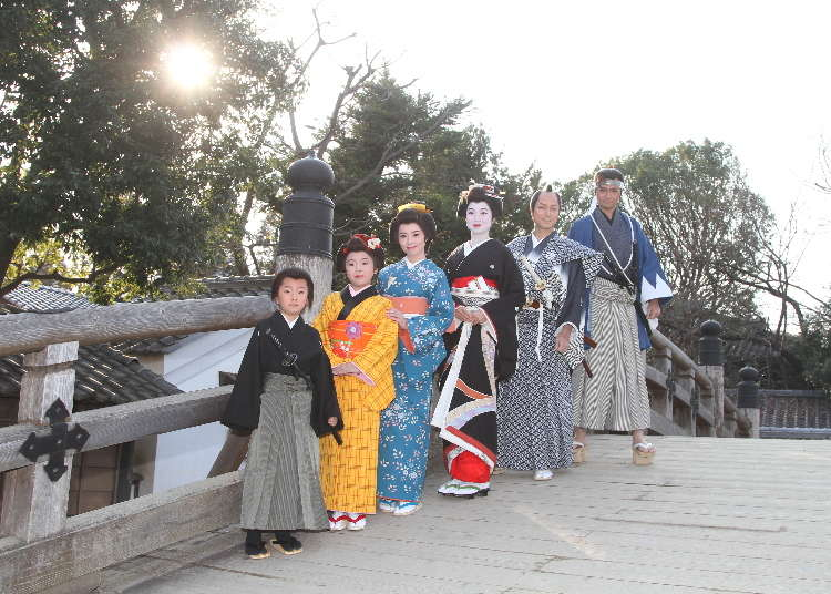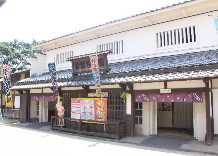 从换装到拍照只要5分钟的神速方案(1900日元)。穿着自己的衣服直接穿上时代剧的服装,迅速换装!在外景拍摄照片后,会配合装扮合成背景,制作出一张纪念照。男性的人气装扮是龙马、武藏、浪人等深色的服装,女性则是公主或是舞妓等,会戴上很多发簪饰品的服装。虽然不能在村内散步,但是一定能成为旅行的纪念。