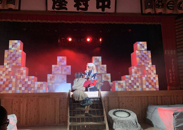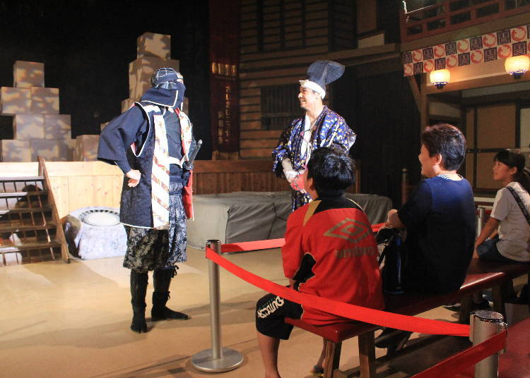拍摄的户外场景中,有一栋特别大的建筑物是名为「中村座」的剧场。是将江户三座之一的中村座重现于此。其中有1天演出3次的「激烈冲突!忍者秀sasuke」。忍者的猿飞佐助与服部半藏在舞台上来回穿梭,打一场超有魄力的生死之战。加上3d影像的效果,让大家能欣赏一场带有紧张担心又有一点好笑的20分钟演出。另外,饰演忍者与君主的演员到刚刚还很认真地一决胜负,还会走到观众席与游客互动,这也是表演的内容之一,可不能错过了!