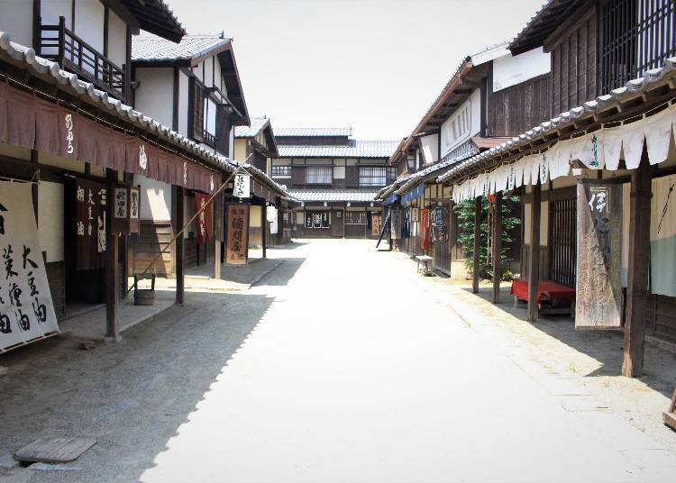 东映太秦电影村是以日本首座的电影主题乐园,建立于1975年,可参观时代剧的拍摄,透过摄影外景、活动或是娱乐表演,来体验时代剧的世界。从正门口进入后,穿过帕迪欧斯影视乐园这栋建筑物走到室外后,往明治通的方向一直走过去,就会看到江户时代的城镇外景。重现出时代剧中常见的江户时代街景,有长屋(一种日本传统的集合住宅)、酱油屋(酱油商)、米问屋(米批发商)等。也有时代剧中常出现的「钱形平次之家」,是一位英雄人物的住宅。