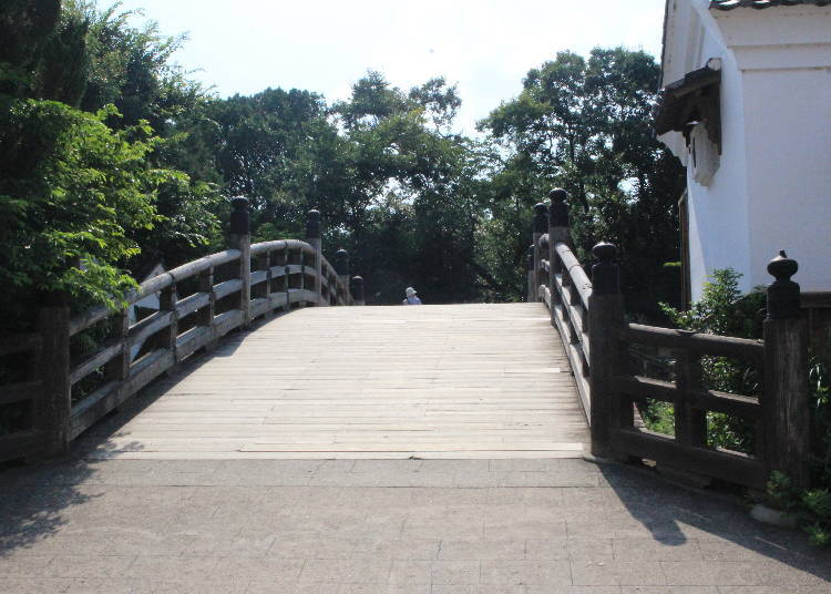 此处是时代剧中常见的拱桥「日本桥」。其实这座桥的后方是楼梯,拍摄时后方是不会入镜的。将栏杆上的文字交换后,一下子就变成京都的三条大桥等。