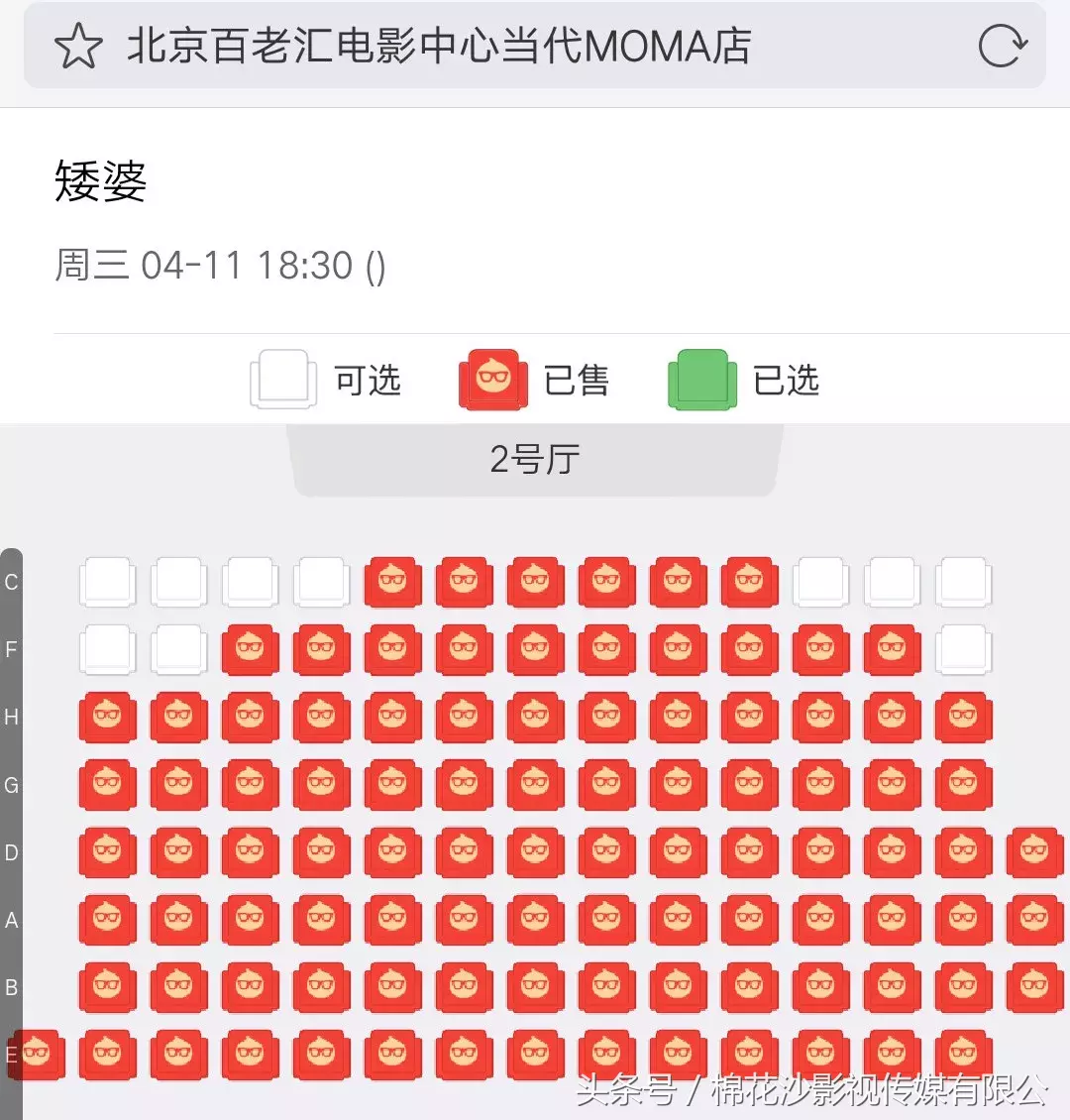 首场放映厅座位(红色为已售出位置) 电影《矮婆》主海报 职员表 内容简介电影放映信息