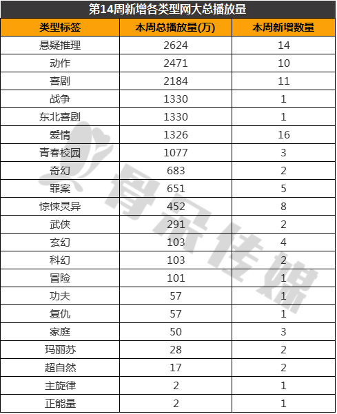 第14周新增各类类型网大总播放量上,喜剧类型网大依旧很稳,总播放量保持在了2000万以上;动作类型超越喜剧类型,总播放量达到2471万。战争类型、东北喜剧、爱情、青春校园的总播放量达到了1000万以上。值得注意的是本周新增了正能量、主旋律两个类型标签的网大作品。