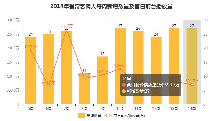 第14周爱奇艺新增网大数较上周持平,但在首日前台播放量上有所下降。从第10周开始,爱奇艺网大首日前台播放量整体呈现平缓下降趋势。