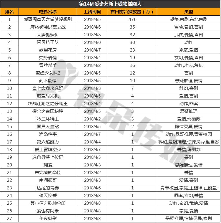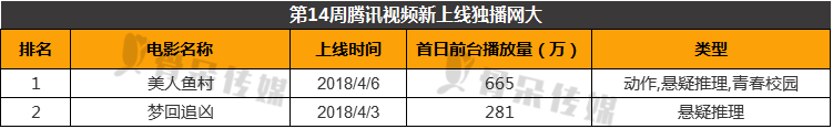 第14周首日前台播放量top10中,排名第一的是腾讯视频播出的《美人鱼村》,该片由深圳市亚日传媒有限公司出品,香港导演梁皓贻指导,首日前台播放量达到665万。爱奇艺播出的东北动作喜剧电影《彪哥闯奉天之做梦没想到》,首日前台播放量达到476万,排名第二。前台首日播放量排名第三的作品来自腾讯视频的《梦回追凶》,首日播放量达到281万。