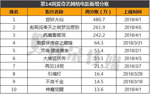 第14周爱奇艺网络电影新增分账中,《捉妖大仙》《彪哥闯奉天之做梦没想到》《疯魔鲁智深》分别以480.7万、261.9万、242.2万的票房分账居于前三甲。