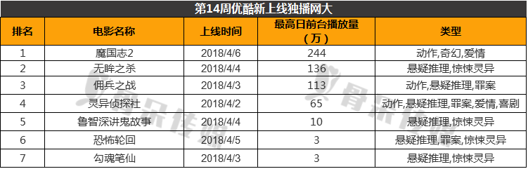 第14周优酷新上线7部网大,首日前台播放量349万,较上周减少63万。新上线网大中以动作、悬疑推理、惊悚灵异居多,且多为类型混搭片。
