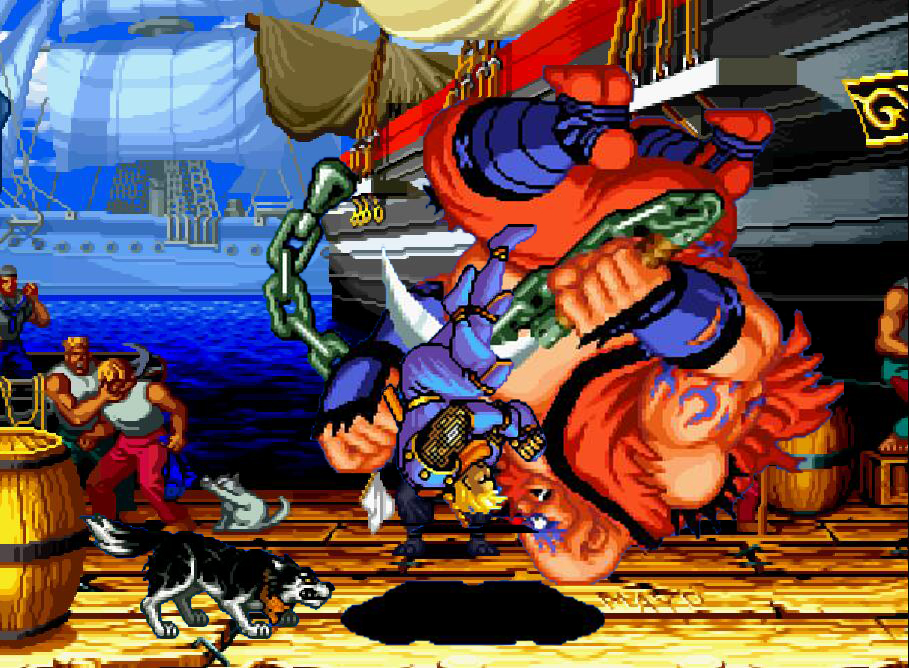 说实话在游戏厅时期,玩人机对战时最喜欢遇到的人就是地震,完全是福利关。就是因为地震的身材庞大,破绽又多,基本上每个人物的套路都可以在他身上实现。投技在地震身上会发生变化,而指令投并没有什么变化,加尔福特和服部半藏的“慧星落”照样可以抓到他。