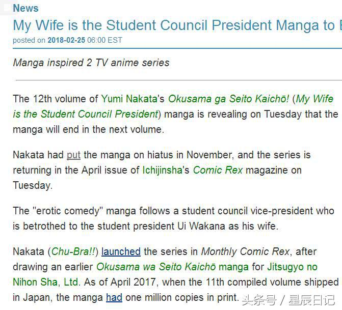 《我老婆是学生会长》是日本漫画家中田由美创作的校园恋爱漫画,曾由seven改编成两季电视动画,本作将在明日(27日)发售最新的第12卷。据悉,《我老婆是学生会长》第12卷宣布漫画将会在次卷完结。
