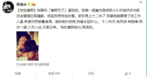 2015年10月份,蔡康永小s两人相继发文请辞《康熙来了》节目组,由于主心骨的离开,随后这档台湾标杆综艺选宣布停播。