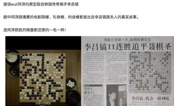 再比如,阿泽的原型就是韩国国手李昌镐,而他对弈棋局时的落子位置都和李昌镐11连胜时完全一致。